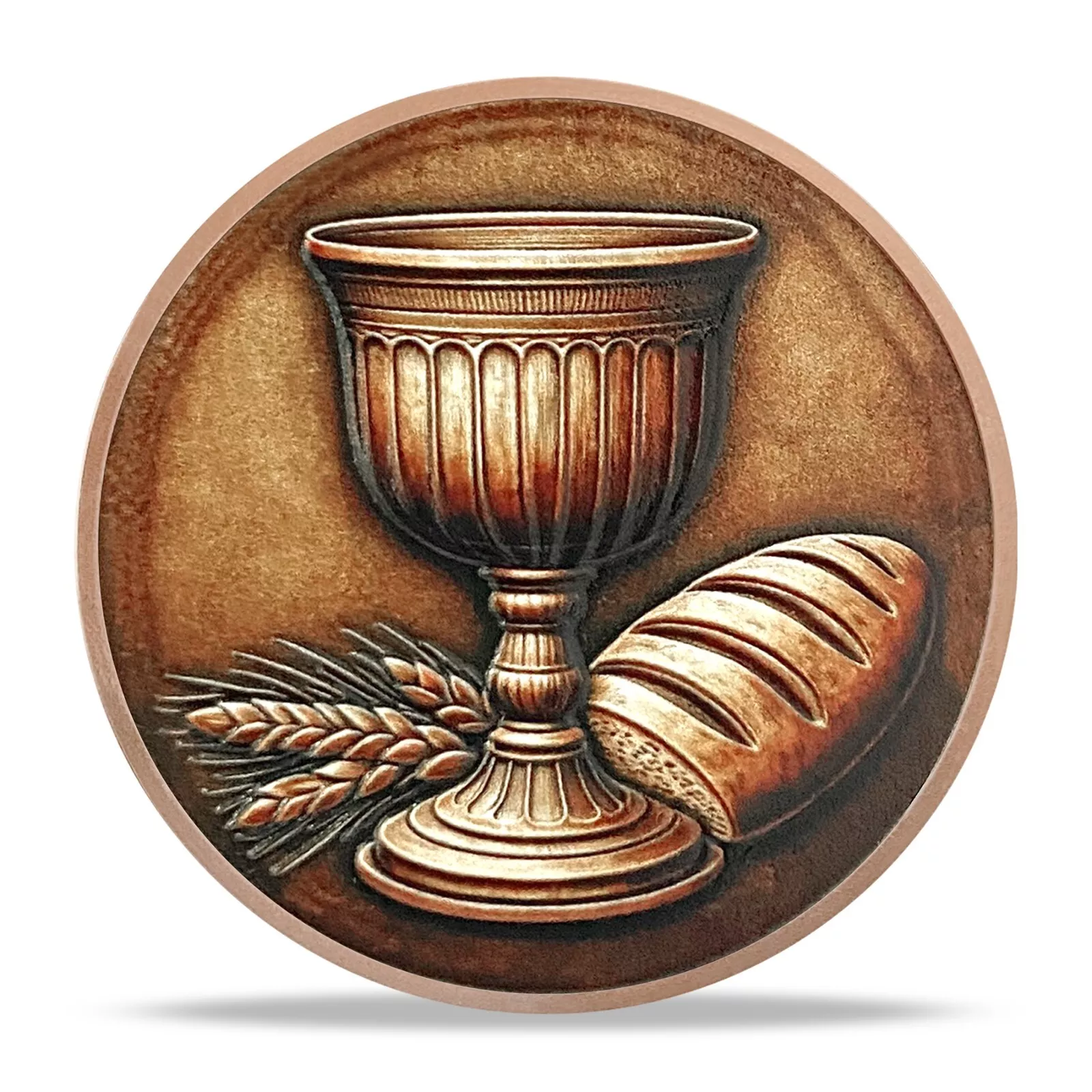 The back is engraved with the Holy Grail, wheat and bread symbolizing the Eucharist, showing the profound interpretation of sacrifice and redemption in the Christian faith.